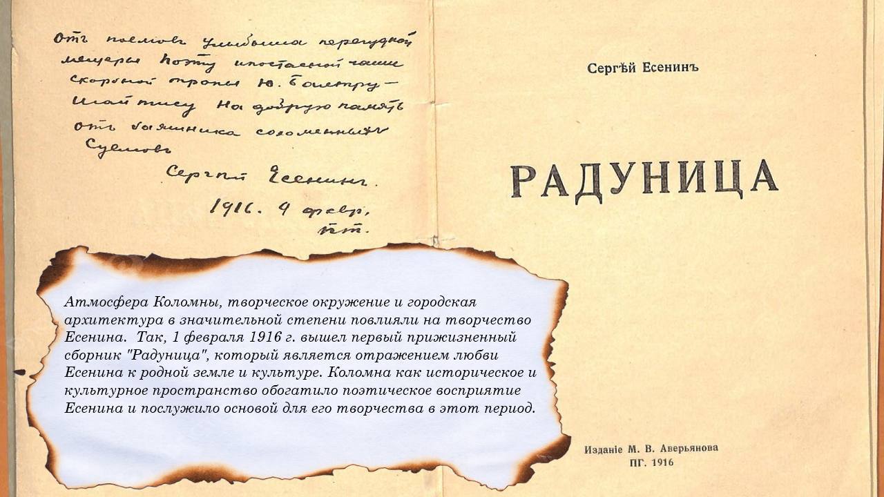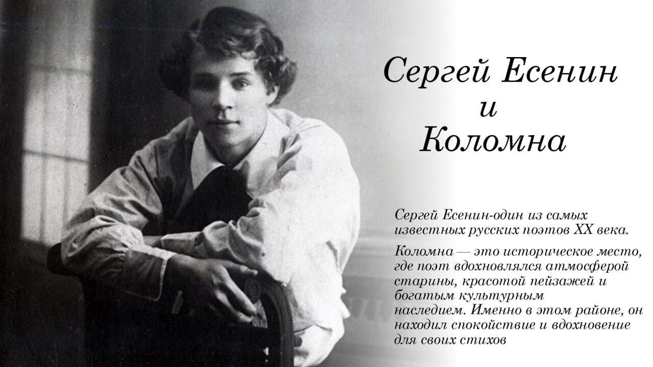 Сергей Александрович Есенин — один из русских авторов, чье творчество продолжает волновать сердца читателей и сегодня. Мало кто знает, что именно Коломна стала тем местом, где юный поэт обрел веру в себя и своё творчество. В этом разделе вы сможете узнать, кто стал вдохновением автора и как развивались события, изменившие его жизнь.